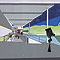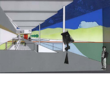 1-b:デッキ木製の細長い歩行デッキを、建築本体からまっすぐ、屋外展示ゾーン・樹林展示ゾーンを抜けてイヴェント・交流ゾーンの末端まで、「彫刻ふれあいの森」全域を突き抜けて一直線に通しています。このデッキは、建築本体をも貫通して駐車場ゾーン側にある屋外展示広場にまで達します。これは一種のランドアートであり、独自の風景を創り上げます。このデッキに周遊園路や彫刻作品が創り出す風景が重なり織上げられ、さらにこのデッキを糸口にして園内の便益施設が重ねられることによって、多様な風景を創り出すことになります。