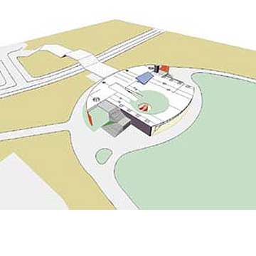 Gファミリーパークは、T市郊外に計画されている総面積76hの公園である。計画地は、南北を山に挟まれながら東に向かって緩やかに下っていく傾斜地で、ひじょうに豊かな自然景観を持っている。 サービスセンターの置かれる場所は、広大な芝生広場に面する公園の西側端部に位置している。ここは、道路を挟んでさらに西に計画されている駐車場から道路越えのブリッジを使ってアクセスしてくる来園者を最初に迎える、いわゆる公園の入口にあたる場所である。 来園者がブリッジを使って道路越えにアクセスしてくるという方法、そのブリッジの高さ、施設を楕円形の地形の中に納めること、しかもその時、既に造園設計が終了している地形の外の区域に一切影響が出ないように計画すること、などがあらかじめ決められていた。 建築設計の趣旨は下記の3点である。