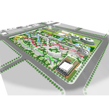 南ゾーンは企業本社等施設群が伸びやかに配置される。北ゾーンは住宅群のほか、地域に開放される体育中心と幼稚園等が設けられる。